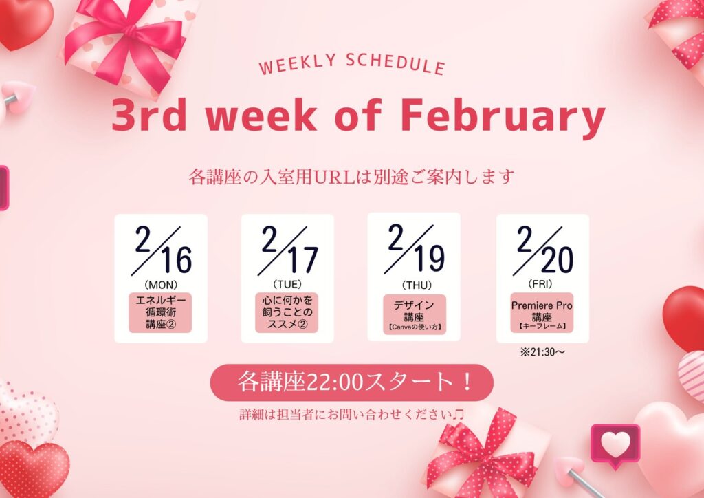 週に3〜5日、主に22:00頃からオンラインで各種講座を開催しており、忙しい方も含めて学べる環境があります。(アーカイブ有り)講座内容は、ビジネスの基礎(マインドセット)、SNS構築に関するマーケティング戦略、そして発信スキルに直結する専門技術指導(動画指導、デザイン添削、AI活用法)など多岐にわたります。